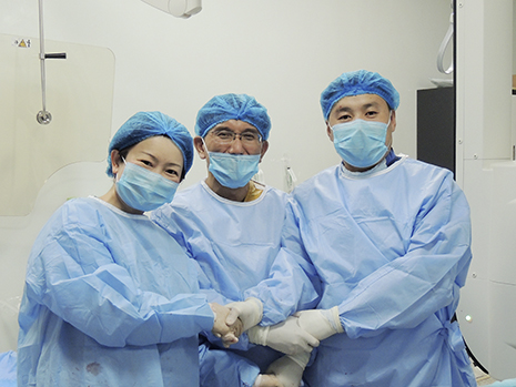 正直なところ、私自身も使用したのは初めてでした。バルーンの位置を決める人、インナーバルーンを拡張させる人、アウターバルーンを拡張させる人の役割を決め、とにかくしっかりシミュレーションをし、実行しました。極力モンゴルの先生たちとコミュニケーションを取って行きたいので、医師同士の会話は基本的に英語で、と思ってはいましたが、さすがにこの時はタイミングをきっちり合わせないと成功しない、という懸念もあったため、昭和大学病院の藤井隆成先生、大阪母子医療センターの松尾久実代先生と3人で日本語で十分にコミュニケーションを取り、幸い、ほぼベストの位置、タイミングで行うことに成功し、良い結果に繋げることができました。日本国内では別の施設にいると一緒にカテーテル治療を行うことも滅多にないので、多施設の先生方とも交流ができ、それぞれの技術を学べるという点では、私たち日本から渡航している医師にとっても非常に勉強になる、良い機会を与えてもらっていると思います。