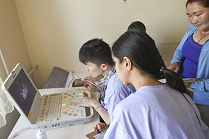 On the next on August 9, we visited the Central Hospital of the Prefecture at 9 in the morning and started the medical examinations after we had meetings the director of the hospital and other officials. On the first day of the medical examination, 90 people visited the hospital. The medical examination was conducted with two portable echocardiographs brought from Japan and one echocardiograph owned by the hospital.