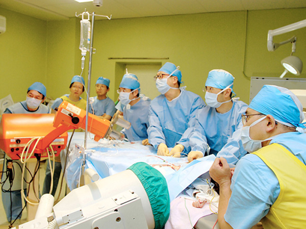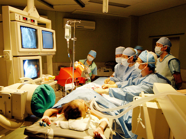 治療カテーテルは8月7日から10日までの4日間連日で行いました。治療カテーテルの内訳は、動脈管開存を経カテーテル的にコイルで閉鎖したのが18名、肺動脈弁狭窄をバルンカテーテルで拡張したのが2名でした。バルン拡張した2名の肺動脈弁狭窄は、右心室が左心室と等圧か左室より高い重症例でしたが、問題なく拡張できました。動脈管開存症例は外科手術から年数が経過した術後残存例の重症例が多かったこと、治療カテーテルの期間が4日間と短かったこと、前もって予定していたよりも多くの患者が来院したことなどから非常にタイトなスケジュールでした。毎朝8時30分に治療を開始し、早いときで夜8時半終了、遅いときは夜中の0時過ぎまでかかることもありました。術後で太い動脈管が残存していた成人例ではコイル脱落がありましたが、無事回収でき、最終的には全員合併症なく終了しました。この症例は平成19年1月の第18回日本Pediatric Insterventional Cardiology研究会において報告いたしました。カテーテル治療した20名のほとんどは心不全症状が顕著でしたが、全員元気になりました。いままでの症例とそのまとめを同じく第18回日本Pediatric Insterventional Cardiology研究会でpreliminary studyとして報告しました。冠動脈血流の変化に関しては、今後さらに症例を重ねていく必要があると考えられます。