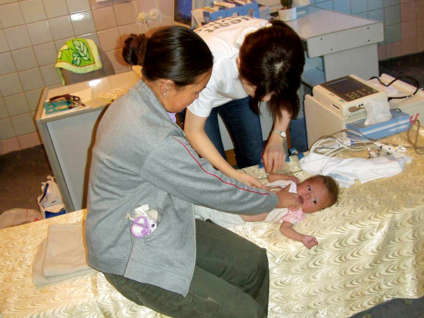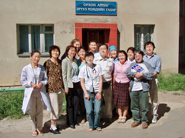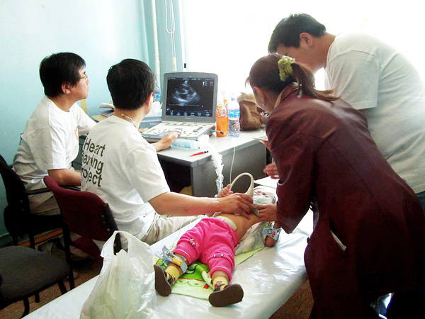 第7回めとなる今回も、今までと同じく全国から有志を募り、資金は広く日本国内からの募金により、器材はその募金によって日本国内で調達して手荷物として持ち込みました。今回は小児循環器医師13名を中心に、研修医・臨床工学士・臨床検査技師・超音波検査技師など計19名で医療チームを編成しました。途中、モンゴル国内のテレビ・新聞などマスコミに大きく報道されたため、予定患者以外にも多数の来院があり、最終的には心エコー検査80名、心臓カテーテルは29名(治療20名、検査9名)に及びました。
