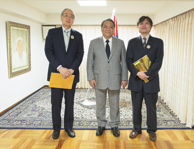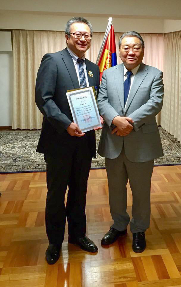授与式は7月26日に駐日モンゴル国大使館で行われ、駐日モンゴル国全権大使S.フレルバートル閣下から勲章を拝受しました。「北極星勲章」は、モンゴルにおける最高の国家勲章であり、外国人に授与される勲章の中では最高位のものです。2017
