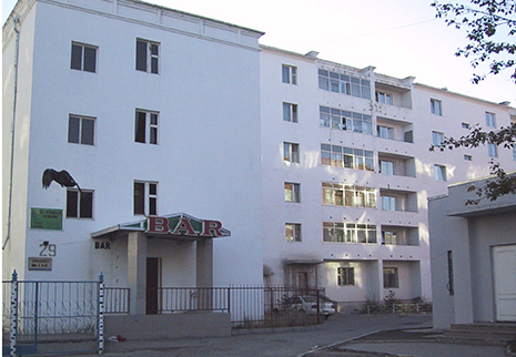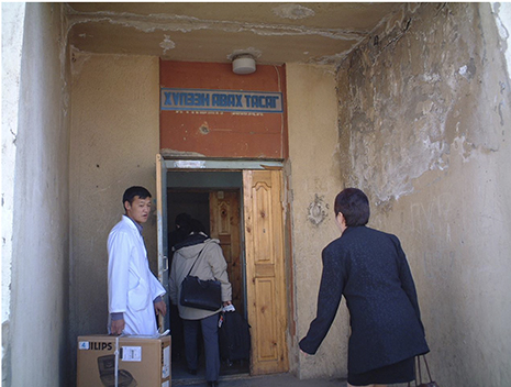 モンゴル国立母子保健センター入口から器材搬入中です。荷物を運んでいるのは、後に島根大学小児科に留学、代謝・遺伝の研修後、現在はモンゴル国立母子保健センターで代謝・遺伝部門のチーフになっている、当時は小児循環器科レジデントであったJamiyan医師です。