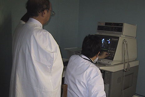 モンゴル国立母子保健センターに1台しかなかった、製造から10年以上経過した旧式の心エコー装置での患者チェック中の写真です。