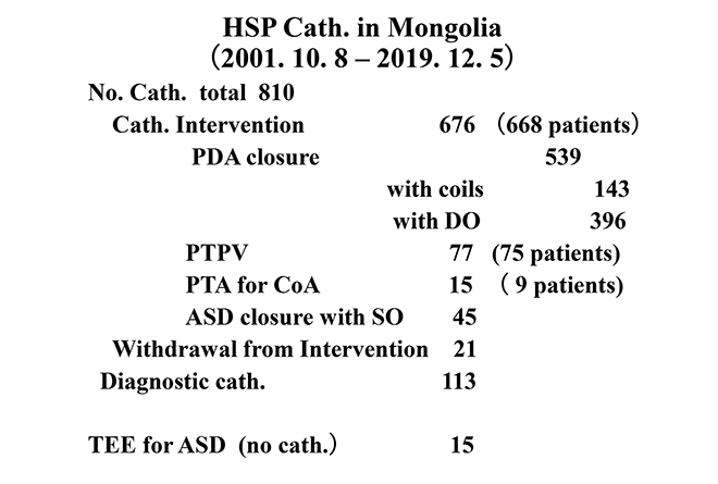 2001年10月8日の第1例から、2019年12月5日までに、ハートセービングプロジェクトがモンゴルで関与したカテ総数と内訳です。カテ総数810件、治療カテ676件(668人)になっています。内訳はPDA閉鎖539人、PTPV(経皮的肺動脈弁形成) 77件(75人)、大動脈縮窄バルーン形成19件(9人)、ASD閉鎖45件、治療を試みて撤退21件、診断カテ113件で、カテをせずに経食道心エコーのみ実施のASD は15件となっています。