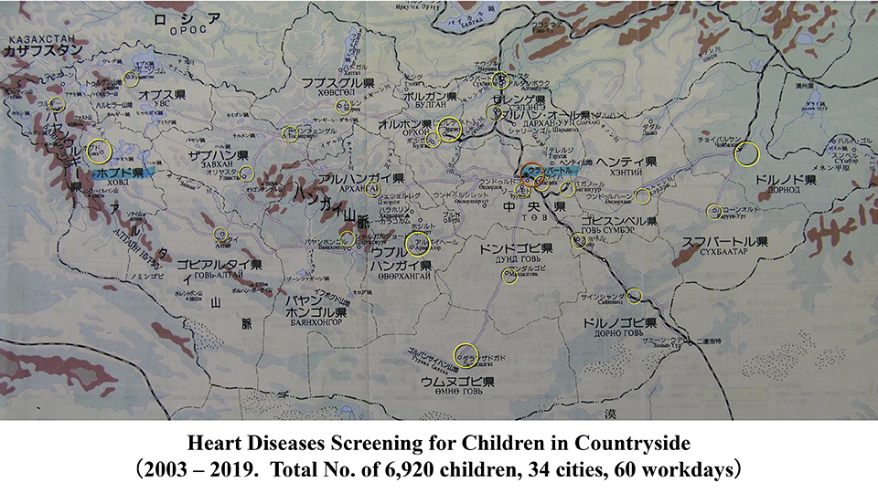モンゴルの地図上に地方検診を実施した都市をプロットしました。2003年から2019年までの検診で、のべでの受診者6920名、実施都市34市、日数60日となっています。