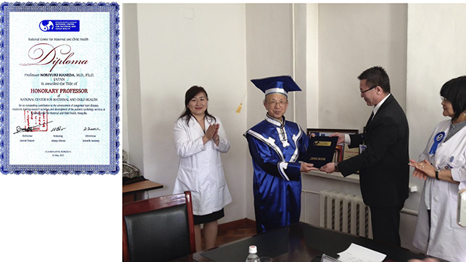 私がモンゴル国立母子保健センター名誉教授に推戴され、2013年5月2日のモンゴル国立母子保健センターでの授与式の写真です。総長から証書と服をいただきました。Bolormaa医師とモンゴル国立母子保健センター子供病院長にも同席していただきました。