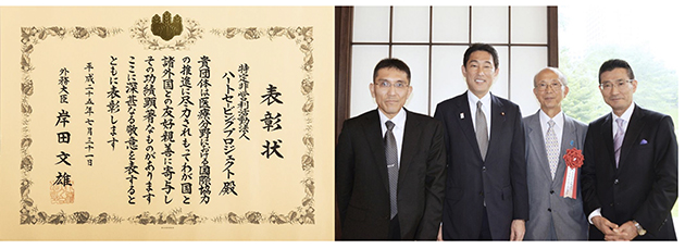2013年7月31日、ハートセービングプロジェクトが日本国外務大臣より表彰され、外務省飯倉公館での表彰式に出席しました。岸田文雄(現 総理大臣)外務大臣と檜垣高史、富田英、羽根田紀幸が記念写真に収まっています。