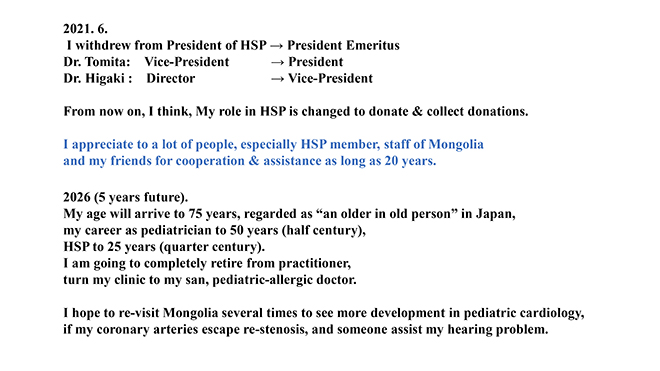 2021年6月にハートセービングプロジェクトの理事長を引退し、永世理事長になりました。理事長は富田医師、副理事長は檜垣医師です。ハートセービングプロジェクトでの私の今後の役割は、自分が寄付をする、寄付を集める、に変化したと思っています。ハートセービングプロジェクトのメンバー、モンゴルのスタッフ、その他多くの方々からの20年間のご協力・ご支援に感謝申し上げます。